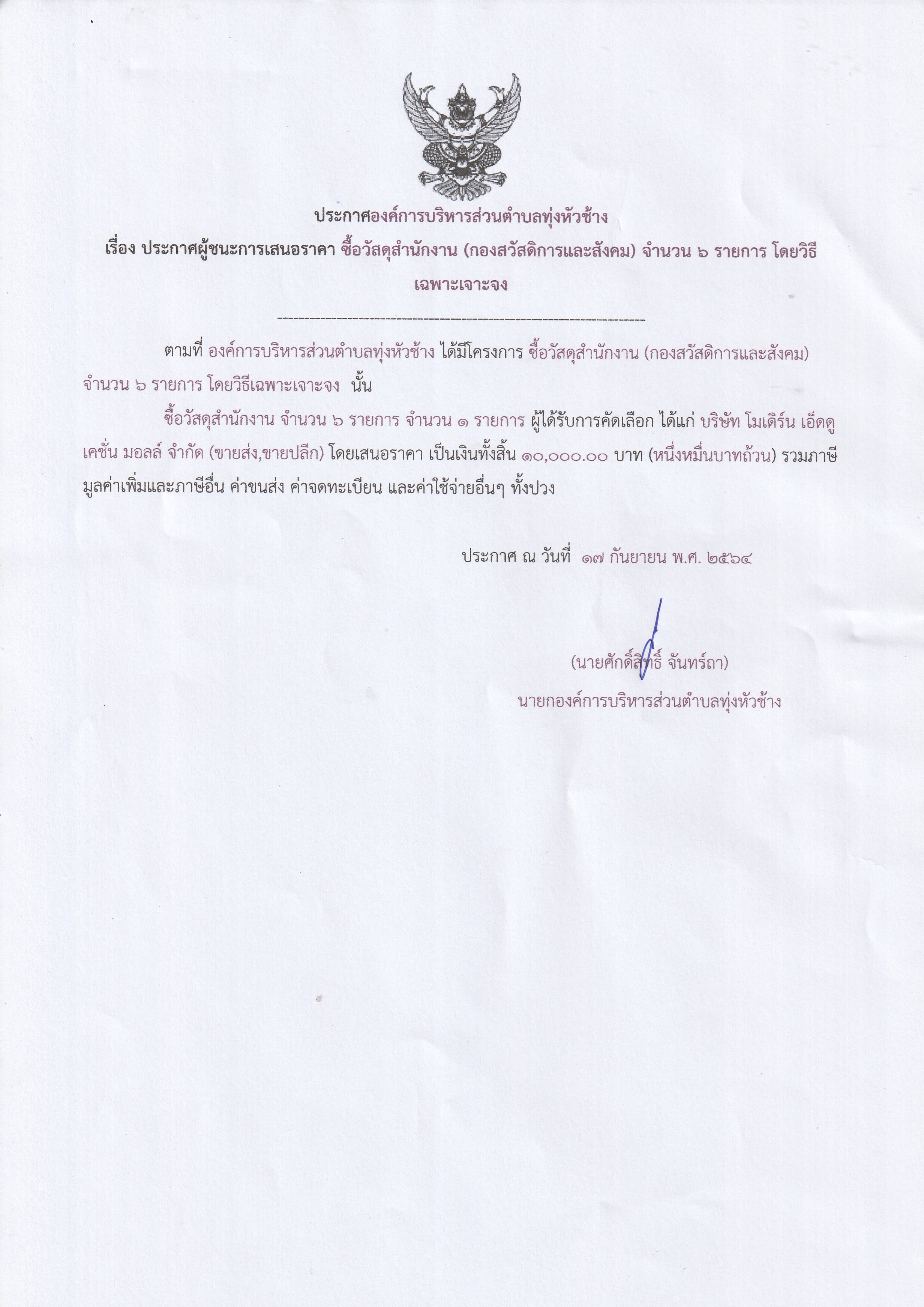 ประกาศองค์การบริหารส่วนตำบลทุ่งหัวช้าง เรื่อง ประกาศผู้ชนะการเสนอราคา ซื้อวัสดุสำนักงาน (กองสวัสดิการและสังคม) จำนวน 6 รายการโดยวิธีเฉพาะเจาะจง