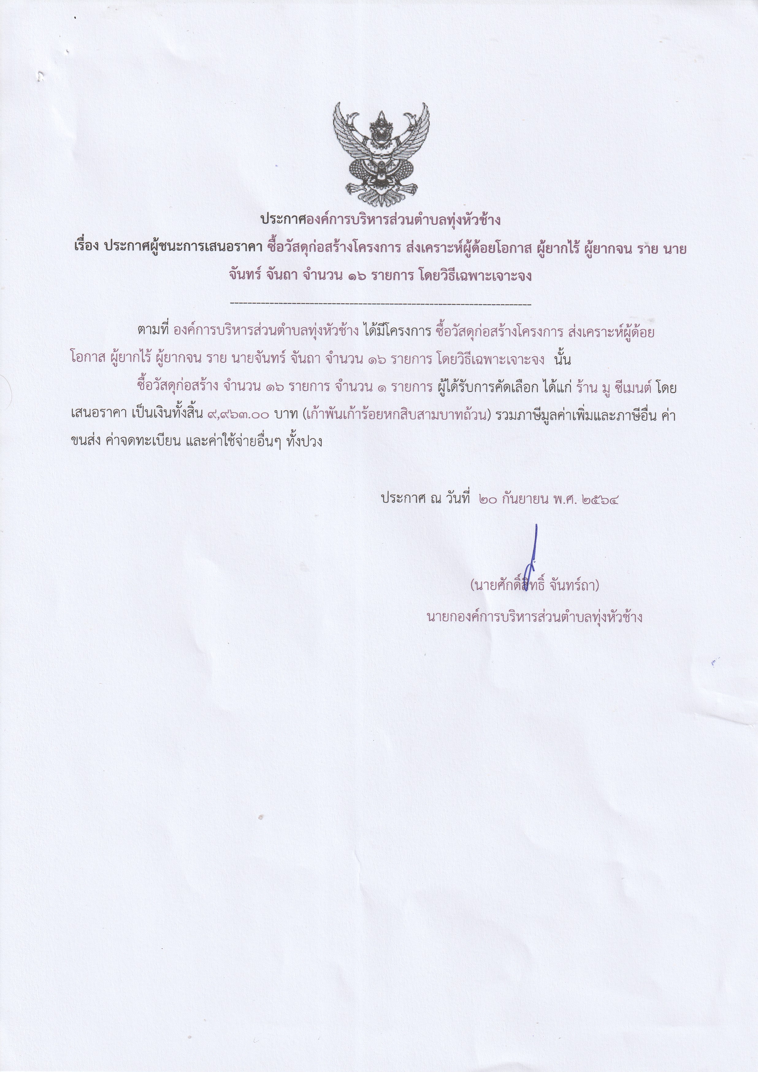 ประกาศองค์การบริหารส่วนตำบลทุ่งหัวช้าง เรื่อง ประกาศผู้ชนะการเสนอราคา ซื้อวัสดุก่อสร้างโครงการ ส่งเคราะห์ผู้ด้อยโอกาส ผู้ยากไร้ ผู้ยากจน ราย นายจันทร์ จันถา จำนวน 16 รายการโดยวิธีเฉพาะเจาะจง