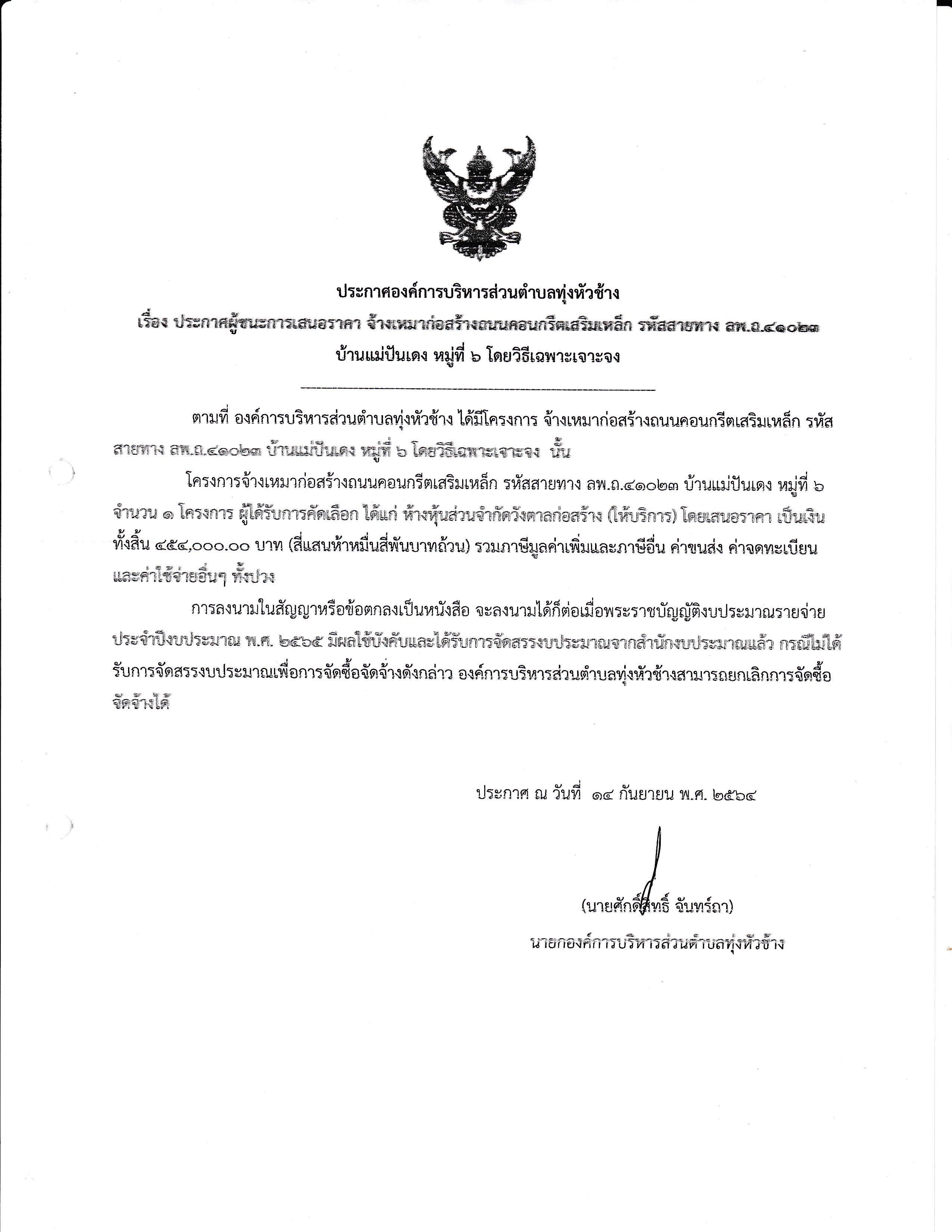 ประกาศองค์การบริหารส่วนตำบลทุ่งหัวช้าง เรื่อง ประกาศผู้ชนะการเสนอราคา จ้างเหมาก่อสร้างถนนคอนกรีตเสริมเหล็ก รหัสสายทาง ลพ.ถ.41023 บ้านแม่ปันเดง หมู่ที่ 6 โดยวิธีเฉพาะเจาะจง