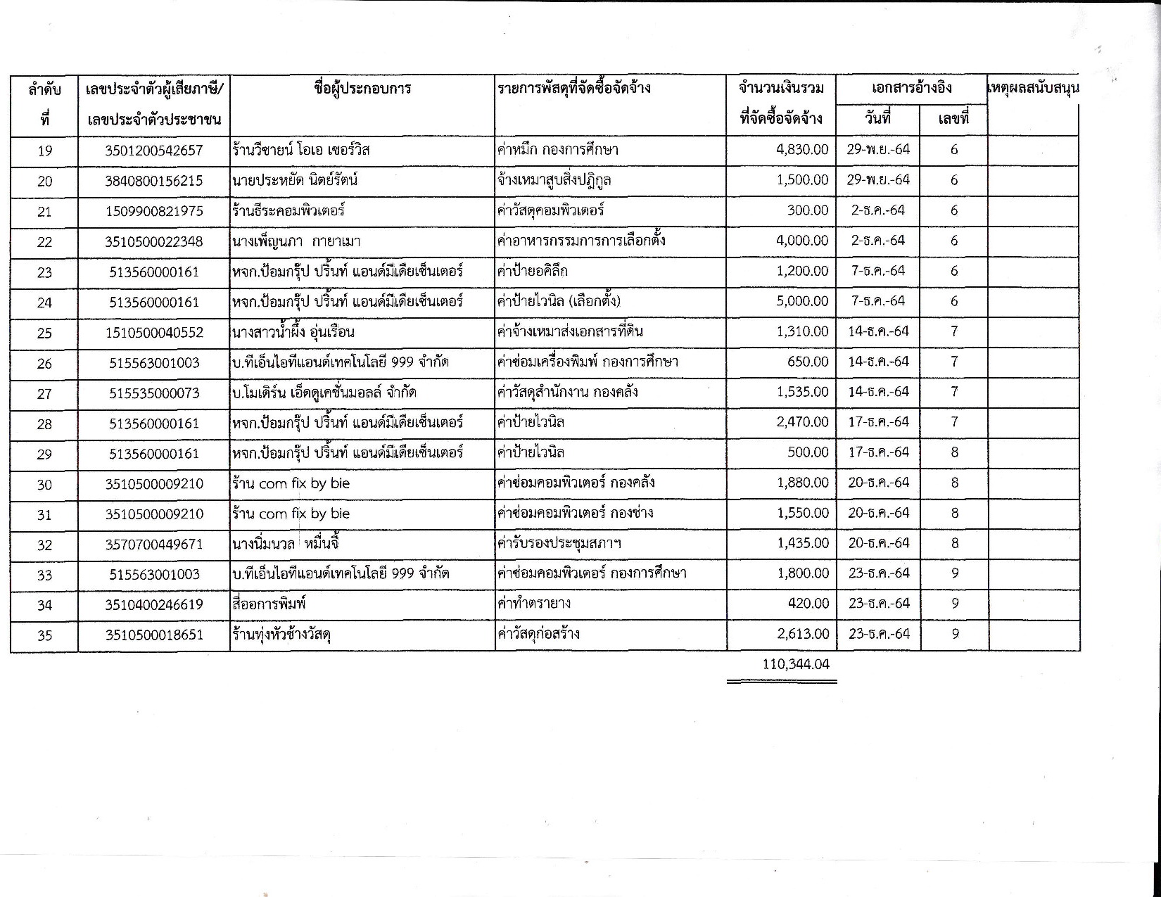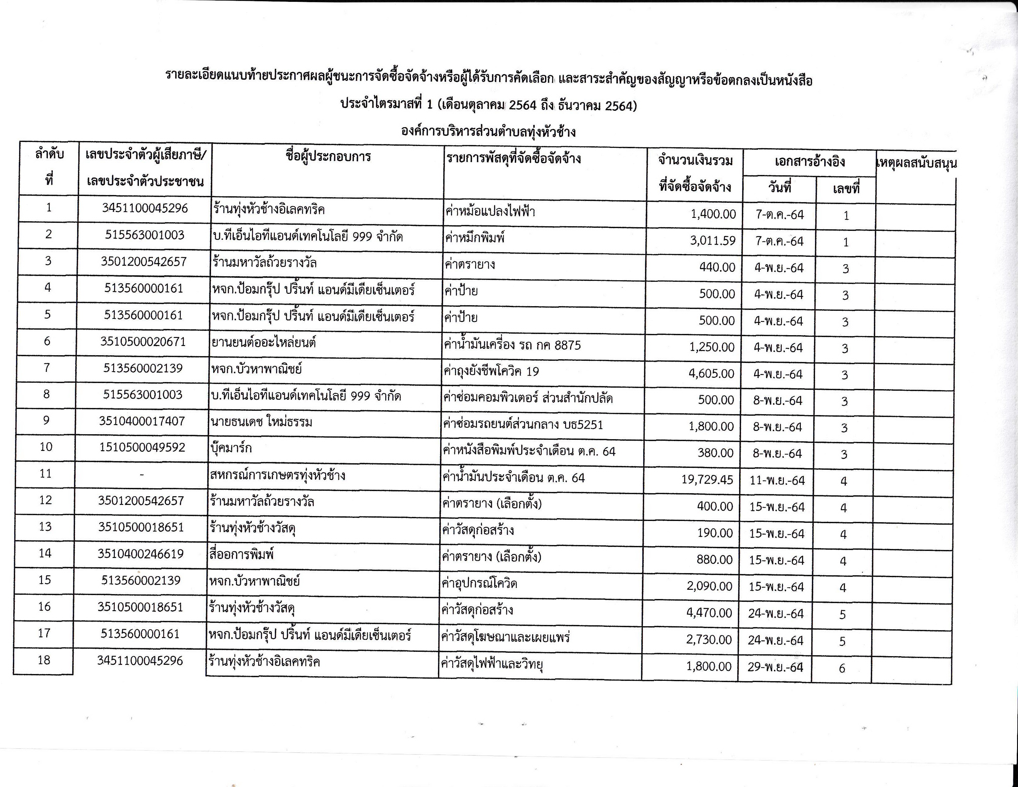 ประกาศองค์การบริหารส่วนตำบลทุ่งหัวช้าง เรื่อง ประกาศผลผู้ชนะการจัดชื้อจัดจ้างหรือผู้ได้รับการคัดเลือกและสาระสำคัญของสัญญาหรือข้อตกลงเป็นหนังสือ ประจำไตรมาสที่ 1 (เดือนตุลาคม 2564 ถึง ธันวาคม 2564)
