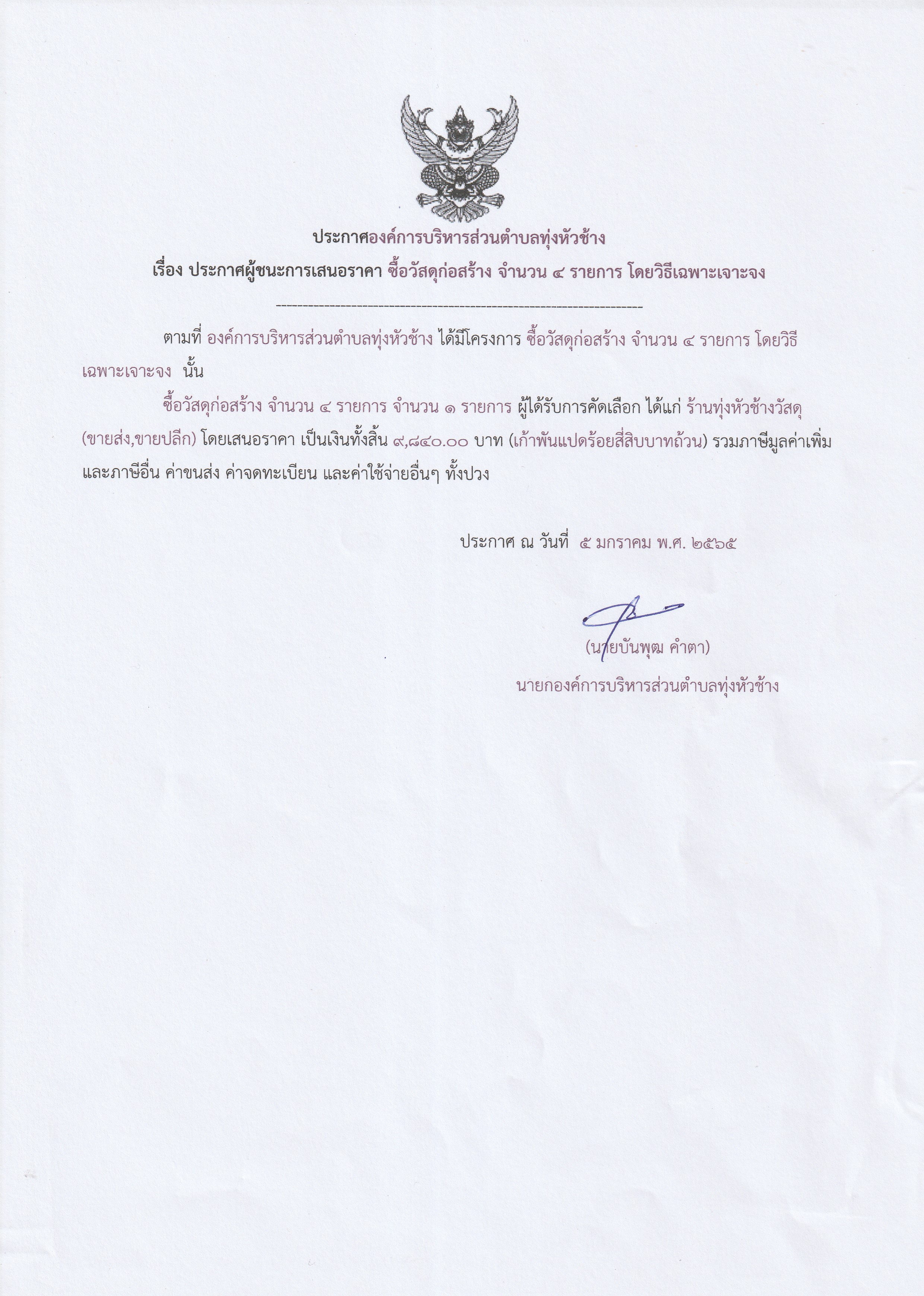 ประกาศองค์การบริหารส่วนตำบลทุ่งหัวช้าง เรื่อง ประกาศผู้ชนะการเสนอราคา ซื้อวัสดุก่อสร้าง จำนวน 4 รายการ โดยวิธีเฉพาะเจาะจง