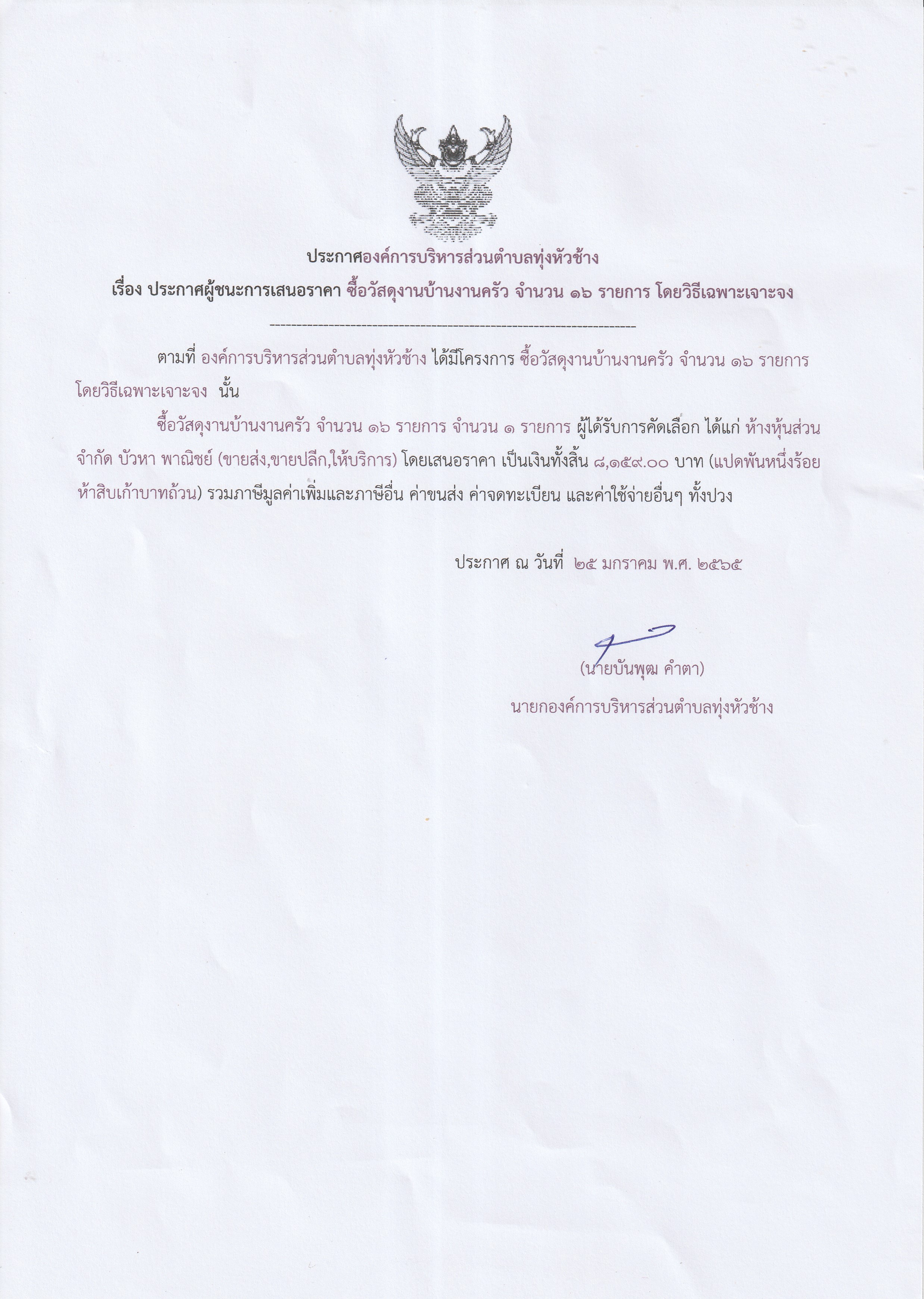 ประกาศองค์การบริหารส่วนตำบลทุ่งหัวช้าง เรื่อง ประกาศผู้ชนะการเสนอราคา ซื้อวัสดุงานบ้านงานครัว จำนวน 16 รายการ โดยวิธีเฉพาะเจาะจง