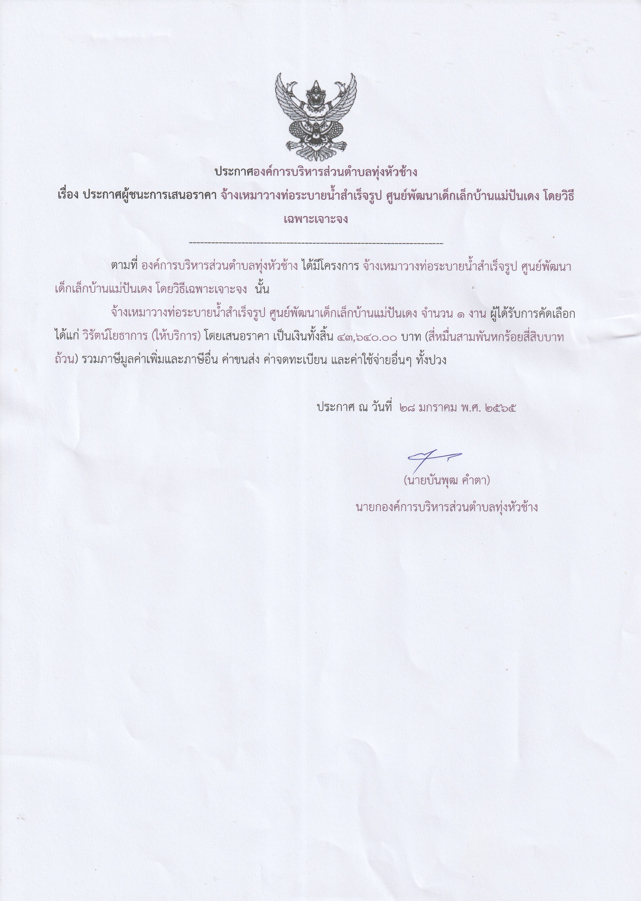 ประกาศองค์การบริหารส่วนตำบลทุ่งหัวช้าง เรื่อง ประกาศผู้ชนะการเสนอราคา จ้างเหมาวางท่อระบายน้ำสำเร็จรูป ศูนย์พัฒนาเด็กเล็กบ้านแม่ปันเดง โดยวิธีเฉพาะเจาะจง