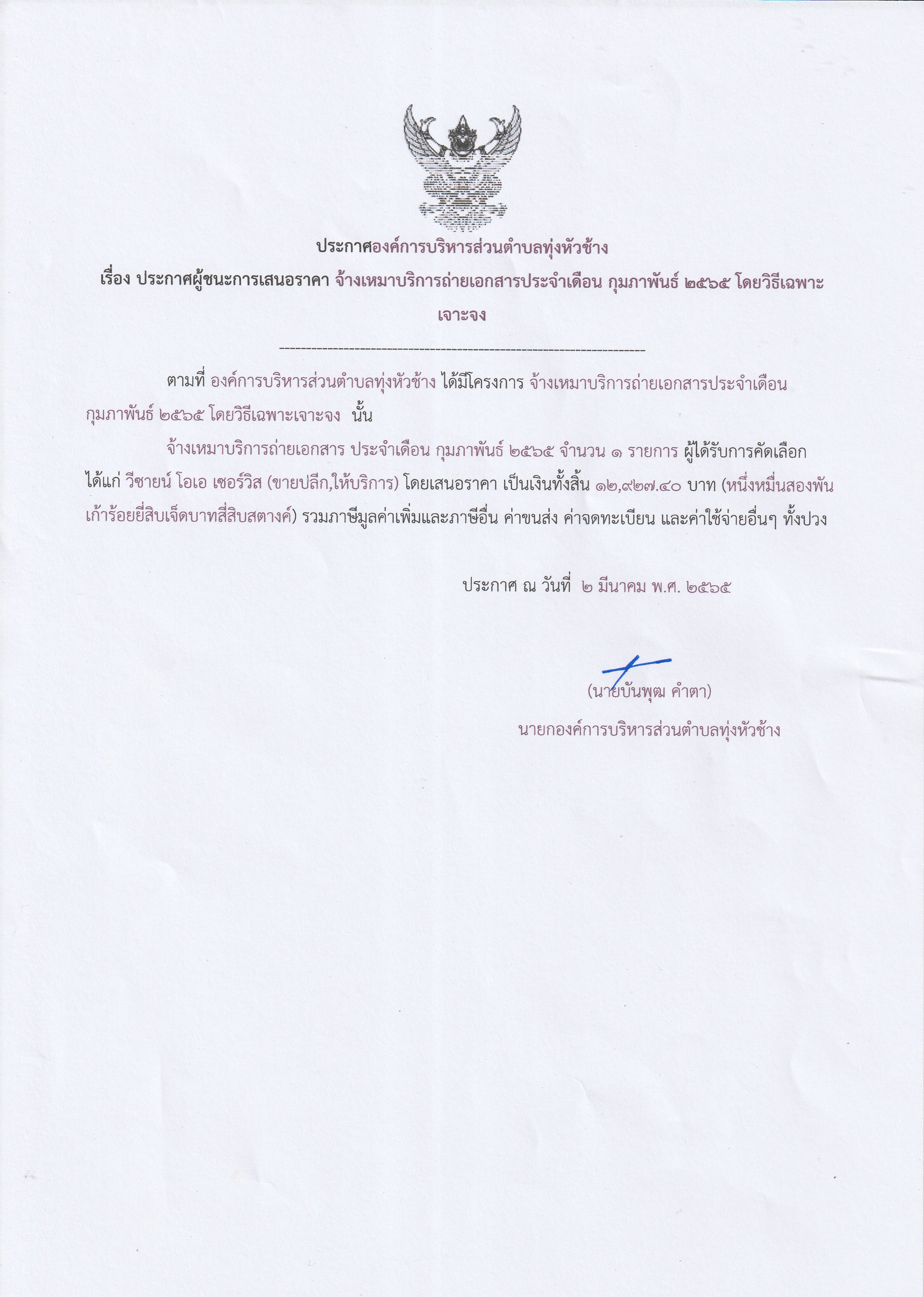 ประกาศองค์การบริหารส่วนตำบลทุ่งหัวช้าง เรื่อง ประกาศผู้ชนะการเสนอราคา จ้างเหมาบริการถ่ายเอกสารประจำเดือน กุมภาพันธ์ 2565 โดยวิธีเฉพาะเจาะจง