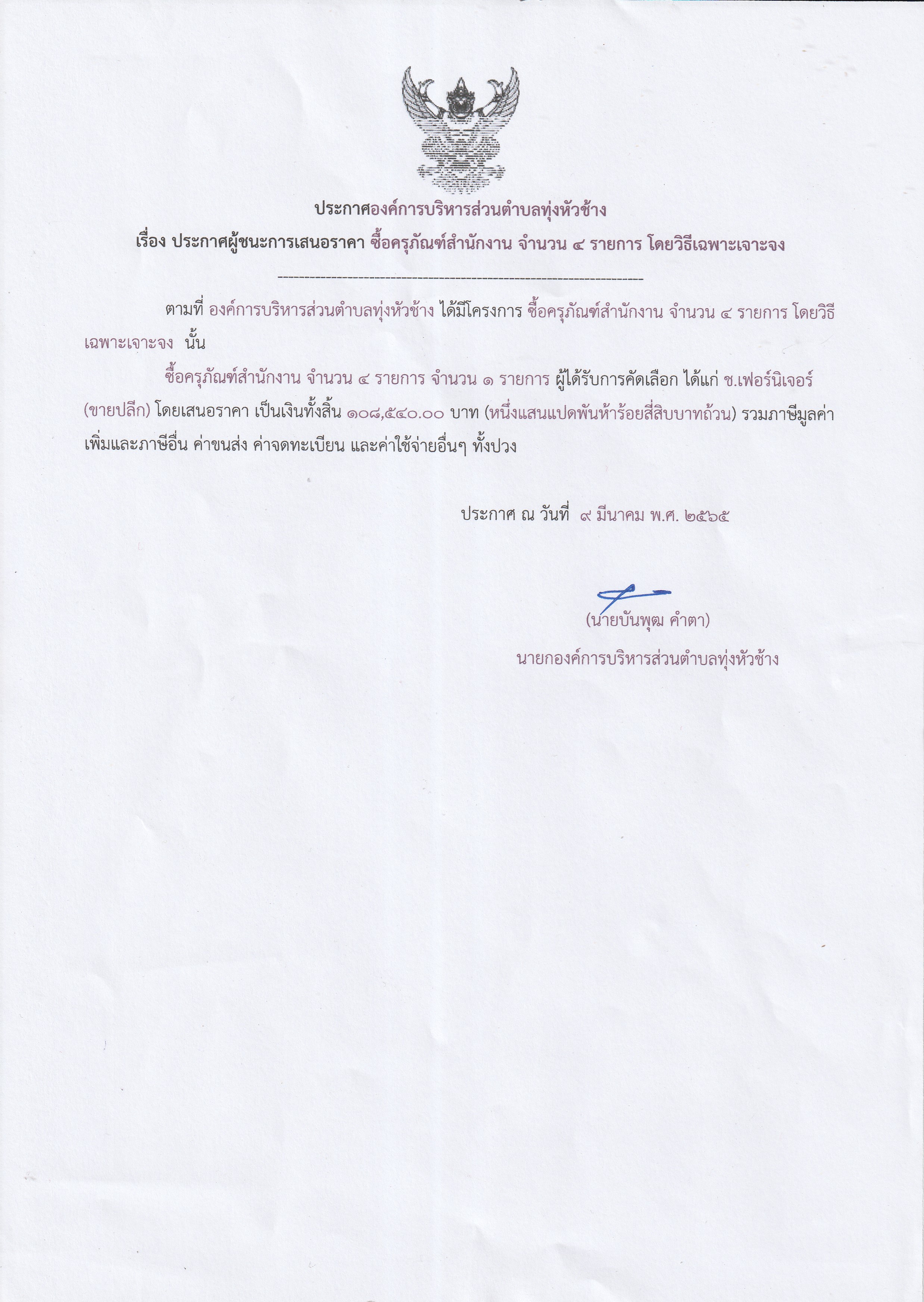 ประกาศองค์การบริหารส่วนตำบลทุ่งหัวช้าง เรื่อง ประกาศผู้ชนะการเสนอราคา ซื้อครุภัณฑ์สำนักงาน จำนวน 4 รายการ โดยวิธีเฉพาะเจาะจง