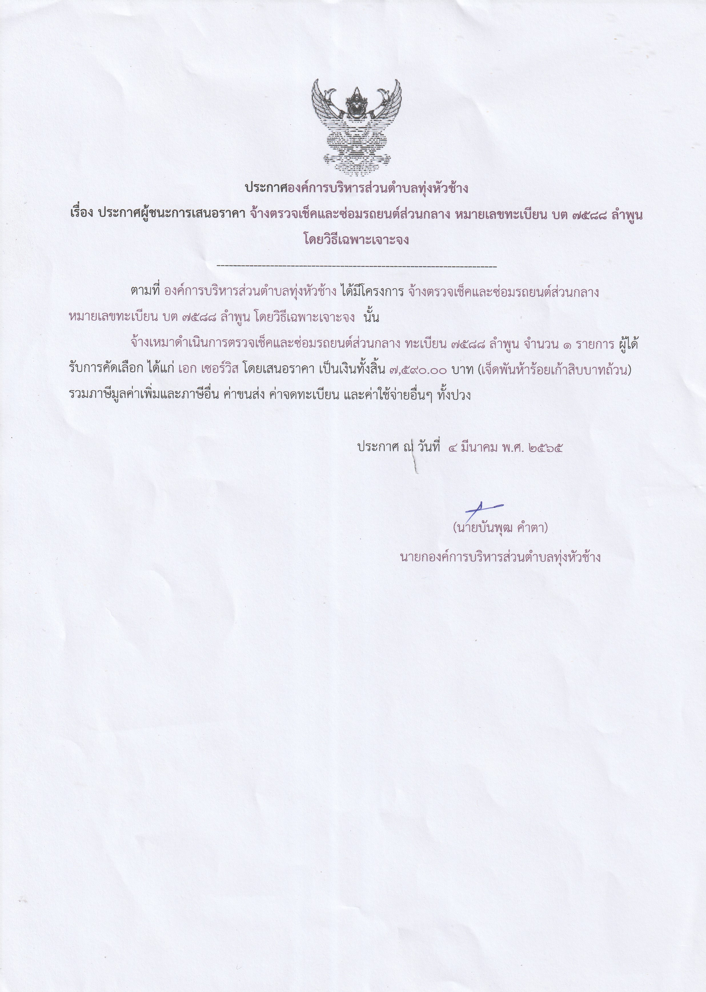 ประกาศองค์การบริหารส่วนตำบลทุ่งหัวช้าง เรื่อง ประกาศผู้ชนะการเสนอราคา จ้างตรวจเช็คและซ่อมรถยนต์ส่วนกลาง หมายเลขทะเบียน บต 7588 ลำพูน โดยวิธีเฉพาะเจาะจง